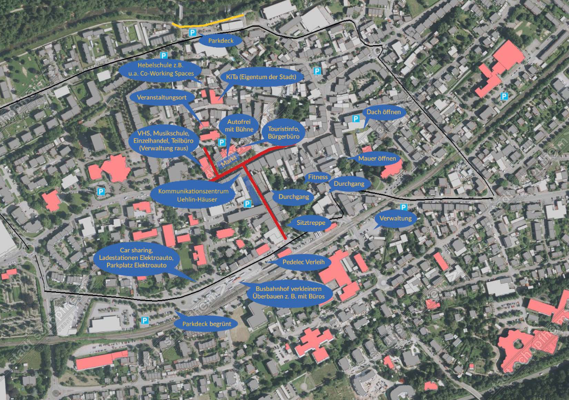 Um die Innenstadt in einen Fußgängerbereich umzugestalten, müssen frühzeitig Planungen auch der Gebäude vorgenommen werden, z. B. sollten zusammen mit der guten Versorgung an Geschäften und Dienstleistern im Alten Bezirksamt und in den anderen Verwaltungsgebäuden inclusive Rathaus Geschäfte und Dienstleister mit möglichst viel Publikumsverkehr angesiedelt werden (Bürger- und Tourismusbüro, VHS, Musikschule, sonstige Kurse, Co-Working, mietbare Sitzungsräume u.a.m.).